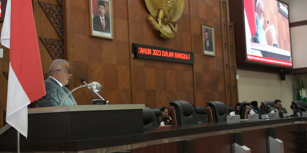 Banda Aceh, Beaktual.com – Sekretaris Daerah (Sekda) Aceh, Bustami Hamzah atas nama Penjabat Gubernur Aceh, menyampaikan Laporan Keterangan Pertanggungjawaban (LKPJ) Gubernur Aceh Tahun Anggaran 2022, dalam Sidang Paripurna Dewan Perwakilan Rakyat Aceh (DPR Aceh), Rabu 5 April 2023 di Ruang Sidang Utama Gedung DPR Aceh. Paripurna itu dipimpin langsung Ketua DPR Aceh, Saiful Bahri, dan diikuti para anggota Dewan, Asisten Sekda, Staf Ahli Gubernur, dan para Kepala SKPA/Kepala Biro di Lingkungan Setda Aceh.