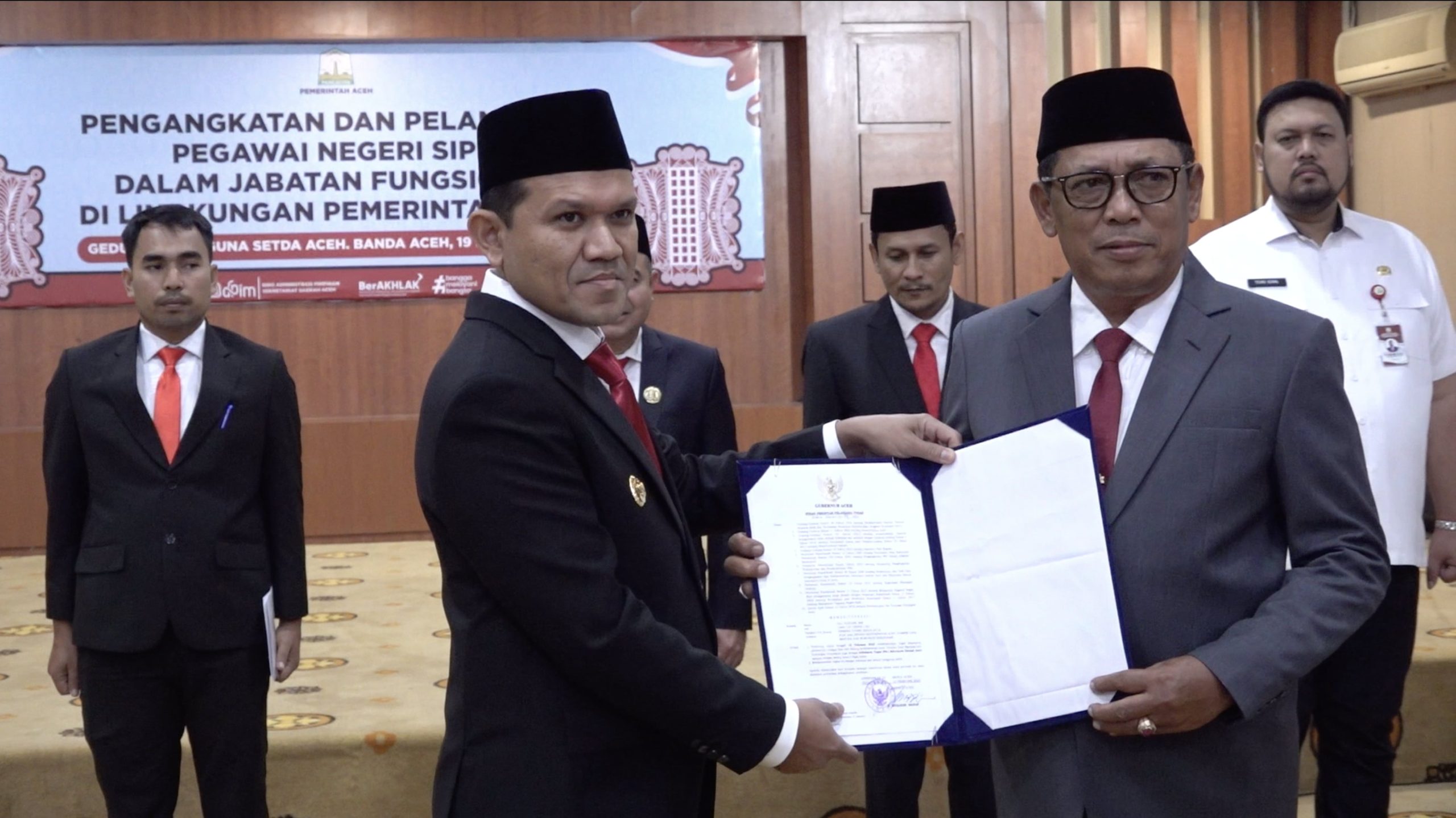 Banda Aceh, Beaktual.com – Wakil Gubernur Aceh, Fadhlullah, menyerahkan surat keputusan (SK) penunjukan Alhudri sebagai Pelaksana Tugas (Plt) Sekretaris Daerah Aceh menggantikan Muhammad Diwarsyah, di Gedung Serbaguna Kantor Gubernur Aceh, pada Rabu, 19 Februari 2025.